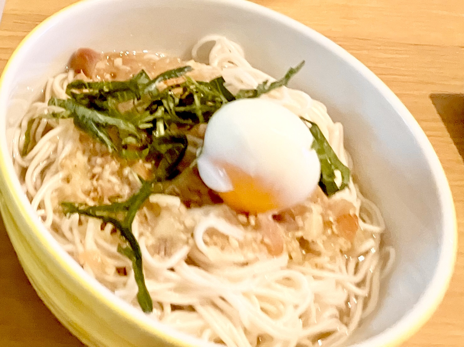 ⑦麺を器に入れ、③の調味料をかけ、③の刻んだ大葉を散らし完成!