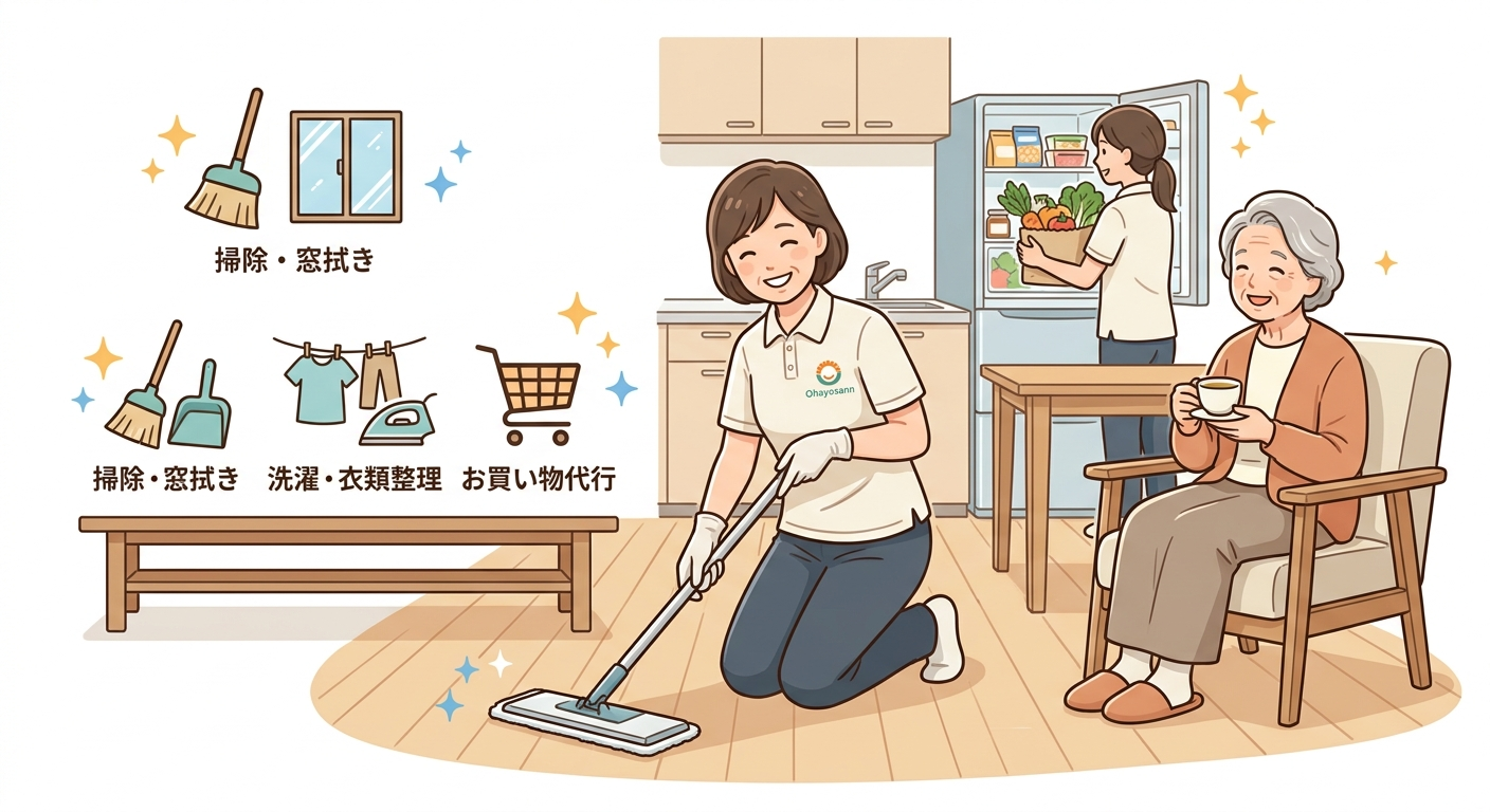 • 季節・丁寧なお掃除: 窓拭き、床のワックス掛け、換気扇の簡易清掃など(介護保険では難しい箇所も対応します)。