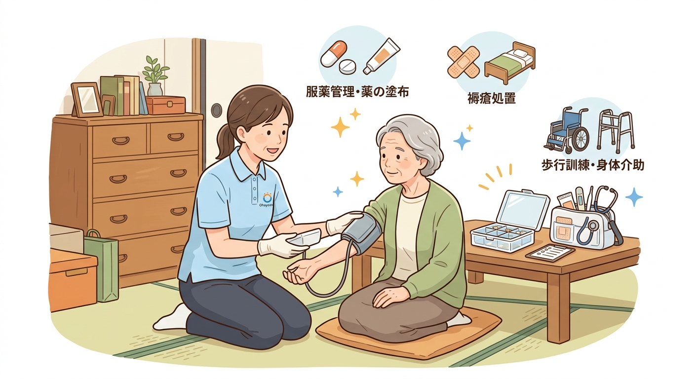 • 服薬管理・薬の塗布・湿布貼付: 飲み忘れ防止の確認や、ご自身では難しい部位への処置。